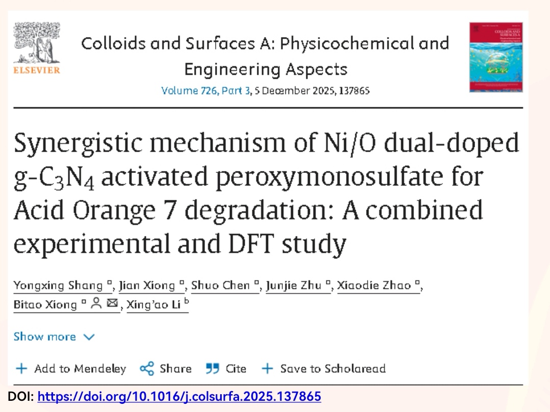 应用物理2022级本科生商永兴以第一作者身份在《Colloids and Surfaces A: Physicochemical and Engineering Aspects》期刊上发表了题为“Synergistic mechanism of Ni/O dual-doped g-C3N4 activated peroxymonosulfate for Acid Orange 7 degradation: A combined experimental and DFT study”的科研文章。浙江科技大学为第一署名单位,应用物理系熊必涛老师为论文通讯作者。《Colloids and Surfaces A: Physicochemical and Engineering Aspects》是ELSEVIER旗下中科院分区SCI二区期刊。