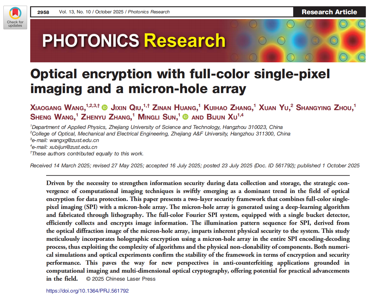 光子与光场调控研究团队在光信息安全处理研究领域取得重要进展,相关研究成果以“Optical Encryption with Full-Color Single-Pixel Imaging and Micron-Hole Array”为题,发表于光学领域顶级期刊《Photonics Research》(影响因子7.2,中科院一区Top)。汪小刚教授、物理系2023级硕士研究生邱基鑫为本文的共同第一作者,汪小刚教授、徐弼军教授为论文的共同通讯作者。