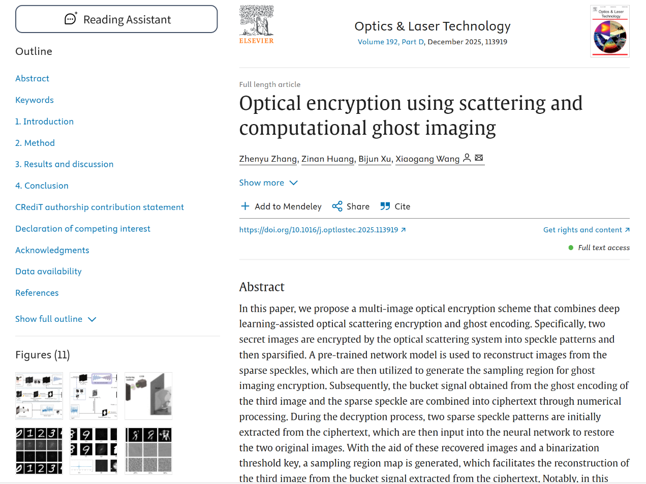 同期,应用物理系2022级研究生张震宇同学也以第一作者身份,在《Optics and Laser Technology》上发表了题为“Optical encryption using scattering and computational ghost imaging”的研究论文。论文提出了一种融合深度学习辅助光学散射加密与鬼成像的多图像加密方案。该方案将两种加密方法高度集成,而非独立设计,这不仅增加了系统的加密容量,还提升了安全性。光学实验结果验证了将散射成像与鬼成像技术结合用于光学加密的可行性。