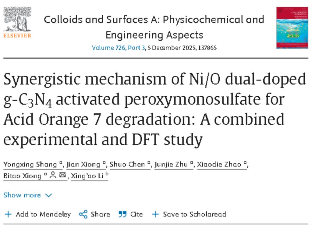 应用物理2022级本科生商永兴以第一作者身份在《Colloids and Surfaces A: Physicochemical and Engineering Aspects》期刊上发表了题为“Synergistic mechanism of Ni/O dual-doped g-C3N4 activated peroxymonosulfate for Acid Orange 7 degradation: A combined experimental and DFT study”的科研文章。浙江科技大学为第一署名单位,应用物理系熊必涛老师为论文通讯作者。