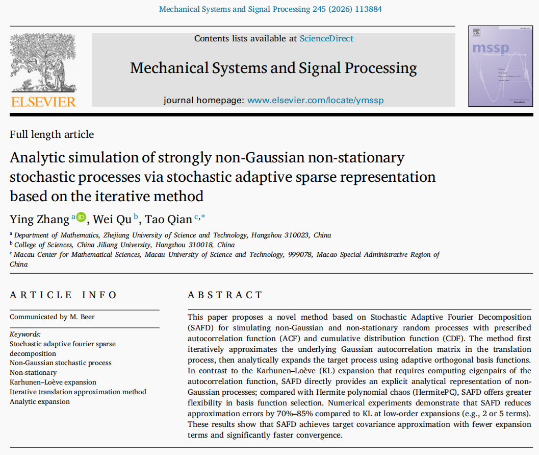 实分析与调和分析及应用团队张影博士与合作者在非高斯随机过程模拟与信号分析领域取得重要研究进展,相关成果发表在国际权威期刊《Mechanical Systems and Signal Processing》(简称MSSP,中科院一区Top,影响因子为8.9)。研究成果以张影博士为第一作者,浙江科技大学为第一完成单位。成果简介如下: